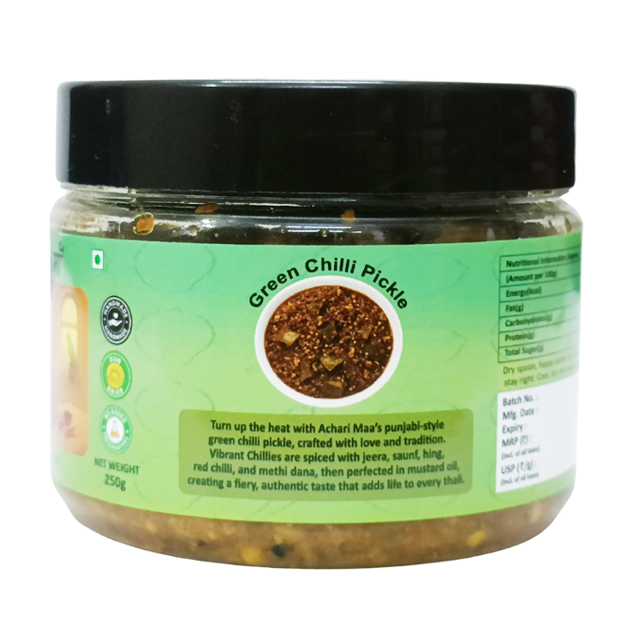 Turn up the heat with Achari Maa’s punjabi-style green chilli pickle, Spicy green chilli pickle, crafted with love and tradition. Vibrant chillies are spiced with jeera, saunf, hing, red chilli, and methi dana, then perfected in mustard oil, creating a fiery, authentic taste that adds life to every thali.