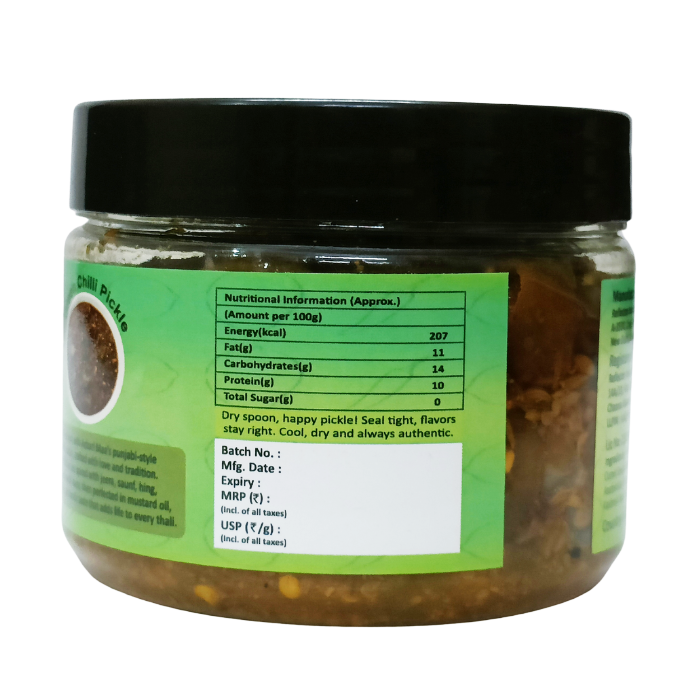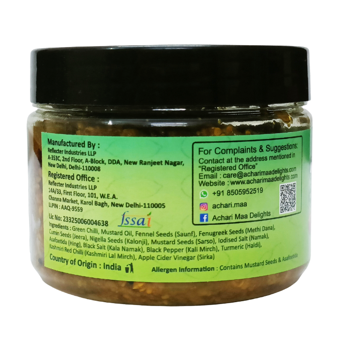 Ingredients:Green Chilli, Mustard Oil, Fennel Seeds (Saunf), Fenugreek Seeds (Methi Dana), Cumin Seeds (Jeera), Nigella Seeds (Kalonji), Mustard Seeds (Sarso), Iodised Salt (Namak), Asafoetida (Hing), Black Salt (Kala Namak), Black Pepper (Kali Mirch), Turmeric Powder (Haldi), Kashmiri Red Chilli (Kashmiri Lal Mirch), Apple Cider Vinegar (Sirka)
