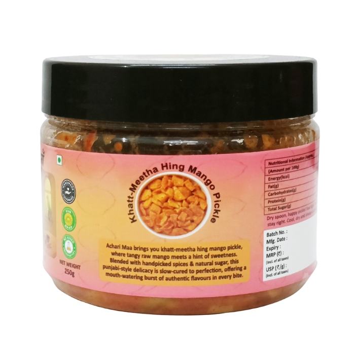 Achari Maa brings you khatt-meetha hing mango pickle, Punjabi mango achar, homemade mango pickle, aam ka achar online, where tangy raw mango meets a hint of sweetness. Blended with handpicked spices & natural sugar, this punjabi-style delicacy is slow-cured to perfection, offering a mouthwatering burst of authentic flavours in every bite.