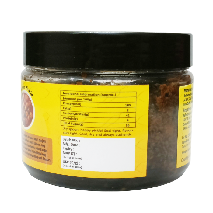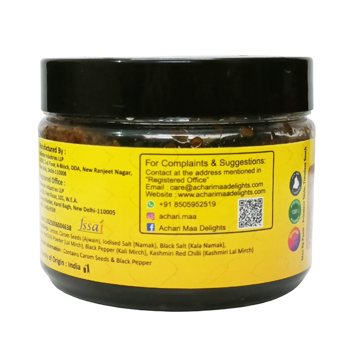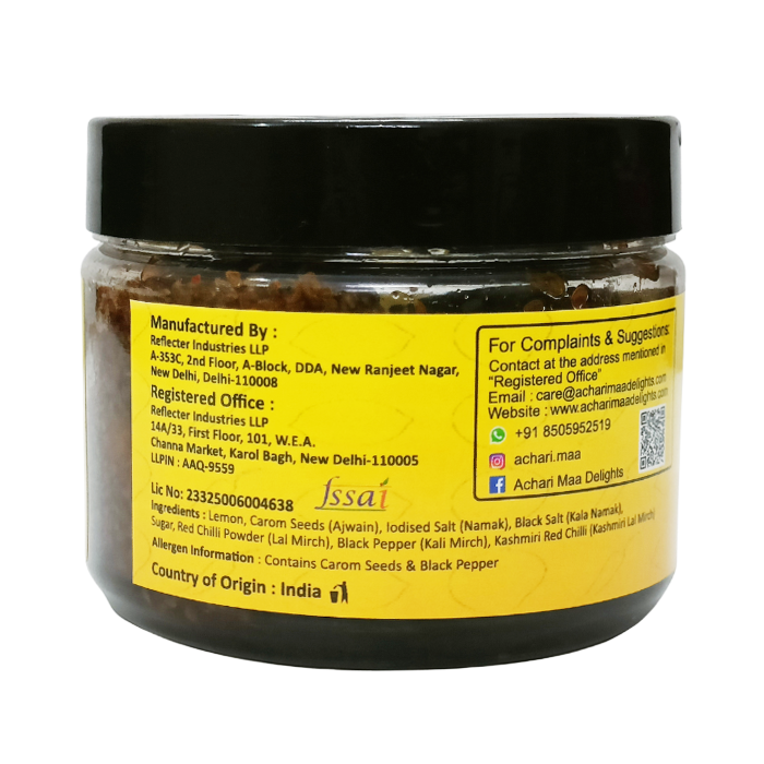 Ingredients:Lemon, Carom seeds (Ajwain), Iodised Salt (Namak), Black Salt (Kala Namak), Sugar, Red Chilli (Lal Mirch), Black Pepper (Kali Mirch), Kashmiri Red Chilli (Kashmiri Lal Mirch)