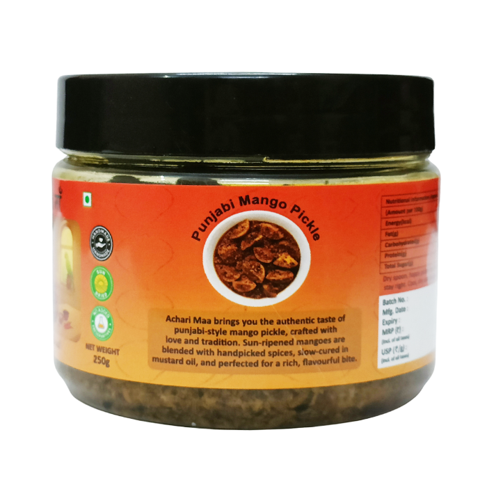 Achari Maa brings you the authentic taste of Punjabi-style mango pickle, Punjabi mango achar, homemade mango pickle, aam ka achar online, crafted with love and tradition. Sun-ripened mangoes are blended with handpicked spices, slow-cured in mustard oil, and perfected for arich, flavourful bite.