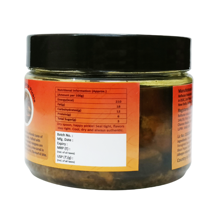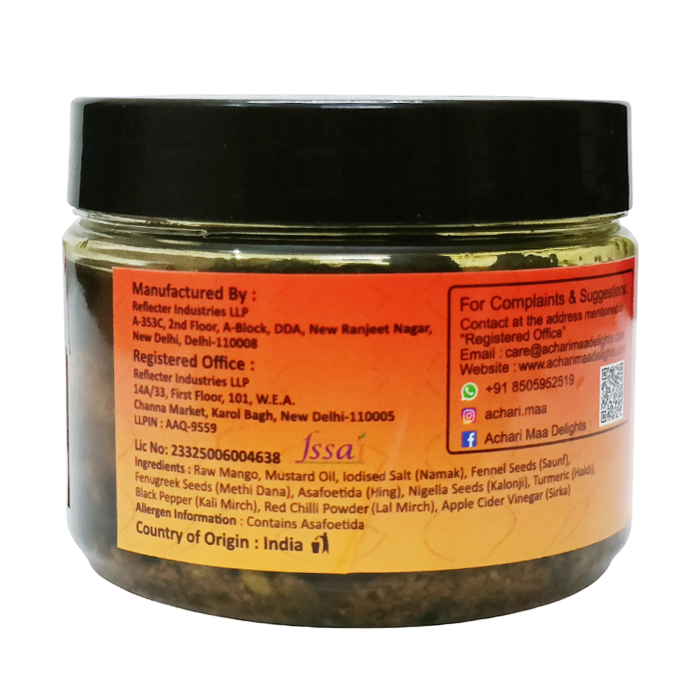 Ingredients:Raw Mango, Mustard Oil, Iodised Salt (Namak), Fennel Seeds (Saunf), Fenugreek Seeds (Methi Dana), Asafoetida (Hing), Nigella Seeds (Kalonji), Turmeric (Haldi), Black Pepper (Kali Mirch), Red Chilli Powder (Lal Mirch), Apple Cider Vinegar (Sirka)